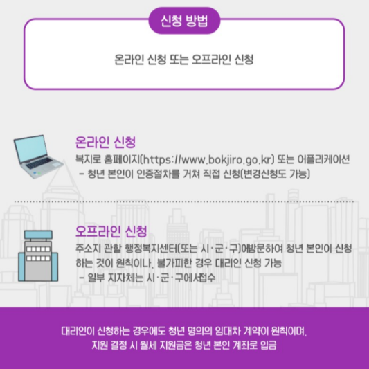 신청방법으로는 거주지의 행정복지센터에서 신청하는 방법과 온라인 신청방법이있는데요 온라인신청은 복지로 누리집과 마이홈포털에서 가능합니다.