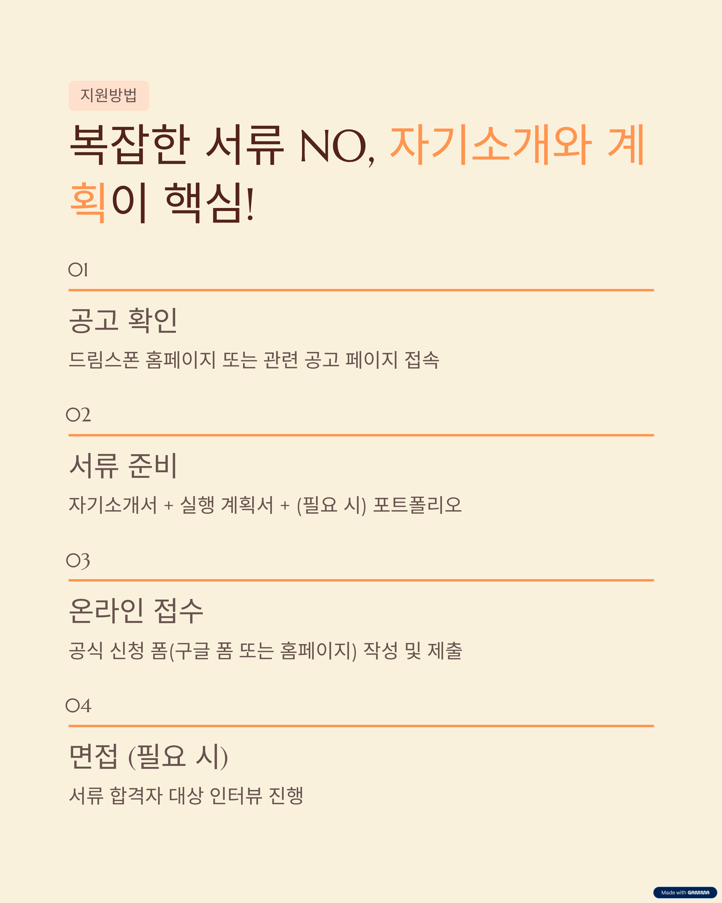 복잡한 서류 절차보다는 '자기소개'와 '계획'이 핵심입니다. 아래 순서대로 준비해 보세요!